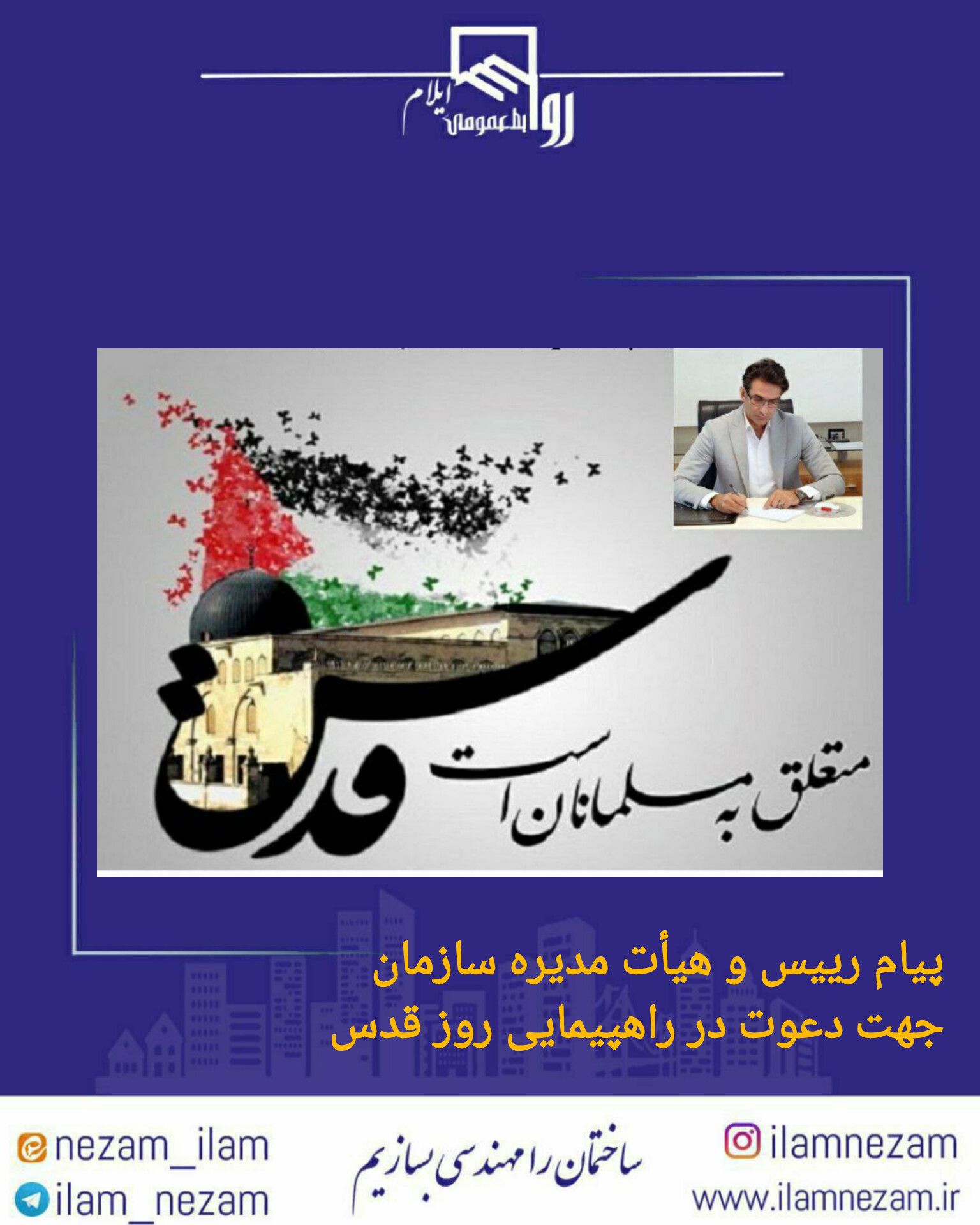ریاست و هیأت مدیره سازمان نظام مهندسی ساختمان استان ایلام در آستانه روز قدس از عموم مردم و جامعه مهندسی جهت شرکت در راهپیمایی روز جهانی قدس دعوت بعمل آوردند
